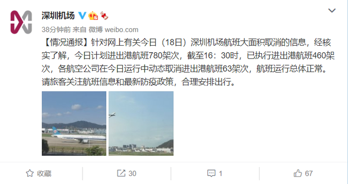 对此,深圳机场回应称,经核实了解,18日计划进出港航班780架次,截至16:30时,已执行进出港航班460架次,各航空公司在18日运行中动态取消进出港航班63架次,航班运行总体正常。请旅客关注航班信息和最新防疫政策,合理安排出行。