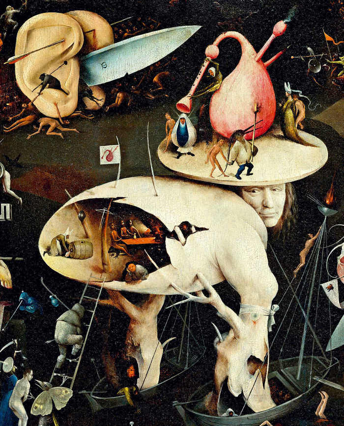 博斯运用蒙太奇手法,把生活里常见的事物用不同方法表现出来,创作出神奇的动物、混合建筑和半人半兽的怪物。
