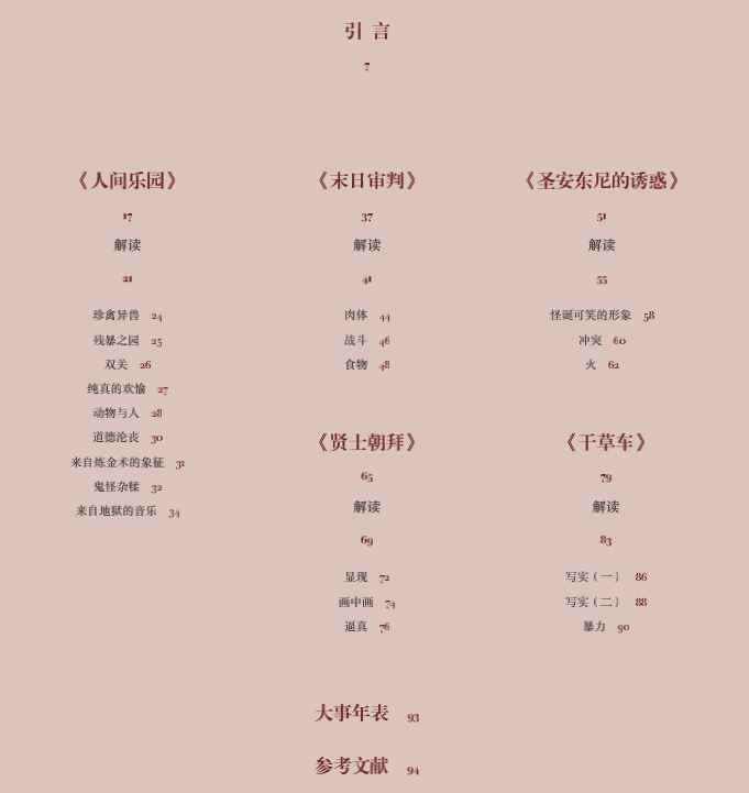本书的5个章节分别对应博斯5幅作品,在每章的“解读”版块,提供了创作的大致时间、尺寸和现藏博物馆,丰富画作信息。