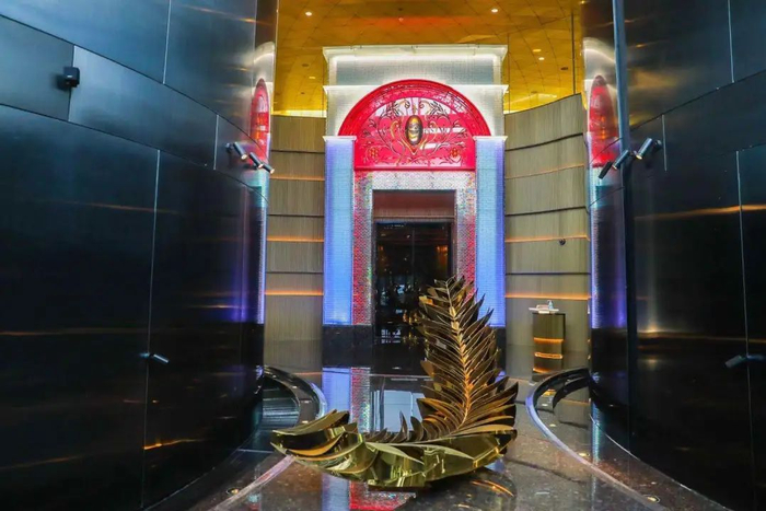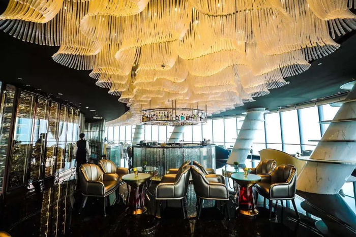 比如101层意大利餐厅里陈设着由意大利著名“建筑幽灵”艺术家Tresoldi 先生手工打造的一件罗马建筑穹顶样式艺术装置,夜间呈现透视效果,使人的视觉停留在虚实之间,打造出如梦似幻的氛围。