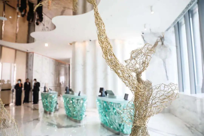 又比如在101层酒店大堂接待台前,你会发现一组轻盈起舞的芭蕾舞者,区别于笨重的材料,这些舞者用金属丝手工编制,来自法国艺术家Pauline女士。