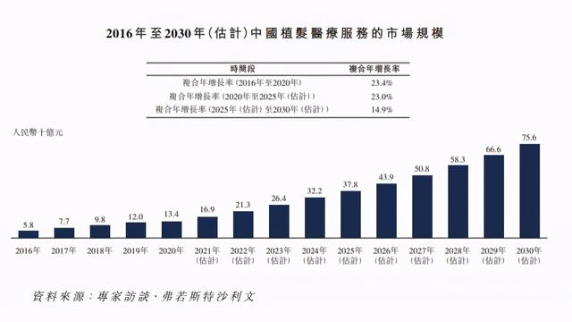 根据咨询机构沙利文的研究数据显示,2020 年中国的毛发医疗服务市场为 184 亿元,预计以复合年增长率 22.3% 的速度增长,到 2030 年将达到 1381 亿元。其中,植发医疗市场在 2020 年的规模约为 134 亿元,预计将以 18.9% 的复合年增长率发展,到 2030 年将达到 756 亿元。