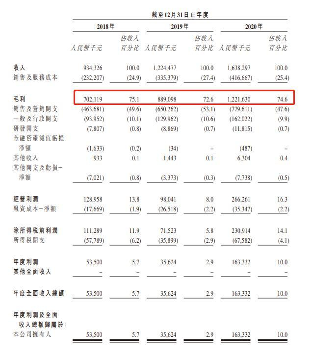 2018~2020 年,雍禾医疗的营业成本分别为 2.32 亿、3.35 亿、4.16 亿,其中员工成本占比最高,分别为 45.6%、43.4%、39.8%。同期,雍禾医疗的毛利分别为 7.02 亿、8.89 亿、12.22 亿,毛利率分别为 75.1%、72.6%、74.6%。