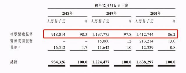 2018~2020 年,雍禾医疗的营业收入分别为 9.34 亿、12.2 亿、16.4 亿,复合年增长率达 32.4%。雍禾的收入主要来自提供植发医疗服务,而来自医疗养固服务的收入也于同期实现了快速增长。