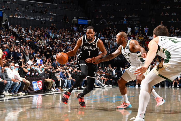 随后双方比分交错上升,当塔克下场休息后,雄鹿选择让霍勒迪防守杜兰特,于是杜兰特连续4个回合低位进攻,篮网均得到分数。