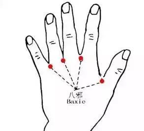 取穴方法:八邪穴的准确位置位于手指背面,微握拳,第1~5指间,各个手指的分叉处,共有8个穴位。