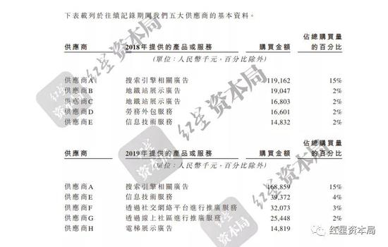 在雍禾医疗前五大供应商中,有三家为提供推广服务的广告平台。2018年,其前三名供应商服务项目分别为搜索引擎相关广告、地铁站展示广告、地铁站展示广告,分别占总购买量15%、2%、2%。2019年第一大供应商服务项目仍是搜索引擎相关广告,占15%。2020年其前五大供应商中广告推广占总购买量的20%。