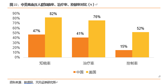 家用医疗设备的另一极具发展潜力的细分市场是电子血压计。高血压是最常见的慢性非传染性疾病,也是心脑血管病发病的第一大诱因。目前,我国心血管死亡占疾病总死亡的 41%(约 350 万人),其中 50%的心肌梗死与高血压相关,40%~50%的心力衰竭源于高血压。国家关于高血压患病的官方数据,根据部分区域调研数据,按比例算出全国的高血压患病率,目前最新的高血压患病率的官方权威数据是国家卫健委2019年8月发布的《中国高血压防治现状蓝皮书2018》中公布的数据,2012年我国18岁及以上人口的高血压患病率为25.20%,2015年上升至27.90%。由此根据2012-2015年的年均复合增长率,结合国家疾控中心发布的关于高血压的人口年增长数量新闻,预测2019年中国高血压患病率达到31.89%。我国高血压知晓率、控制率和达标率分别为 46.9%、40.7%和 15.3%。虽然相比过去已有明显提升,但若和美国 82%的知晓率、76%的治疗率和 52%的达标率相比,仍有较大差距。