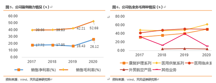 公司毛利率在2020年有着非常明显的上升趋势,由42.21%增长至52.68%。如下图所示医用供氧系列和康复护理系列作为公司的主要营收贡献产品,近年来毛利率增长非常稳定。