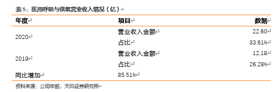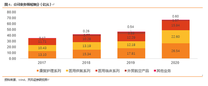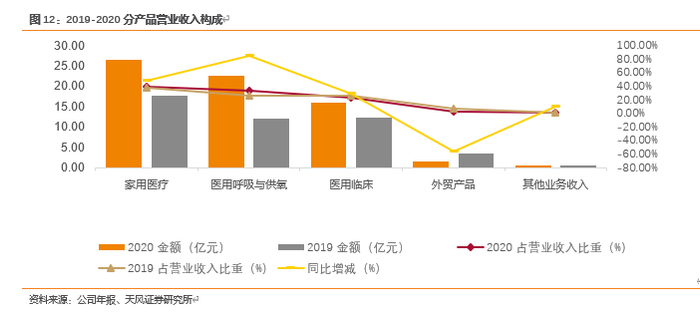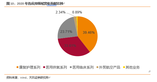 公司目前的第一收入来源于家用医疗康复护理系列产品,2020年为公司贡献收入26.54亿元,占营业收入总额的39.46%。公司的第二大收入来源为医用供氧系列产品,2020年为公司贡献收入22.60占营业收入总额的33.61%。