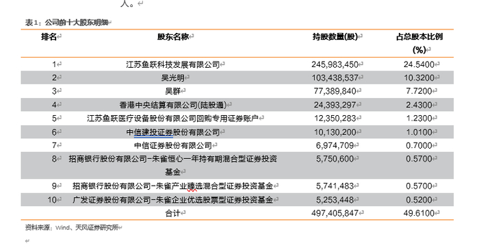 鱼跃医疗成立于1998年,是一家以提供家用医疗器械、医用临床产品以及与之相关的医疗服务为主要业务的公司,研发、制造和销售医疗器械产品及提供相关解决方案是公司核心业务,也是公司主要业绩来源。公司产品主要集中在医用呼吸与供氧、家用医疗及慢病管理、院内外消毒感控、手术与眼科器械及中医器械等领域。截止2021年第一季度,江苏鱼跃科技发展有限公司为公司第一大股东,占总股本24.54%,吴光明为公司实际控制人。