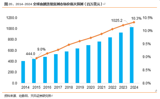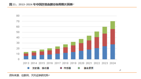 家用医疗设备未来潜力最大的细分市场之一是连续血糖监测仪设备。对糖尿病患者而言,每日有测试血糖的需求。目前最普遍的血糖测试设备是指血血糖仪,但指血血糖仪只能测到患者某个时间点的血糖值,不能监测患者在运动、吃饭、睡觉时的血糖水平。而且针刺取血对患者也是一个刺激,当时测出的血糖值并不能反应患者真实的血糖水平。