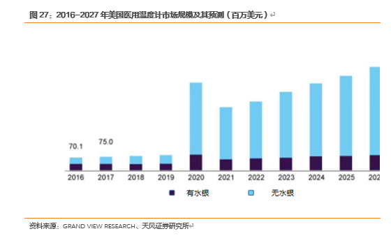 以北美市场为例,据研究机构Grandview Research 统计,2019年,美国医疗温度计市场规模为8570万美元。预计从2020年到2027年,医疗温度计复合年增长率将增长28.7%。且美国已经有13个州禁止传统的玻璃水银温度计,这促进了非接触式温度计的销售。近年美国环境保护局(USEPA)一直在科普关于汞的危害性的相的认识。目前,红外线温度计因为其非接触性的特性在北美公共场所广泛用于体温筛查。