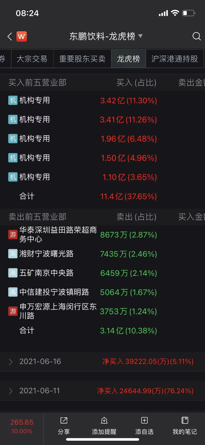 根据6月17日Wind盘后龙虎榜,东鹏饮料获5家机构买入共11.4亿元,合计买入占当日37.65%。