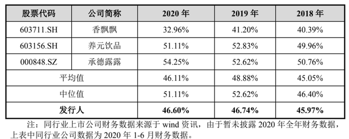 2018—2020年,东鹏饮料的产品毛利率分别为45.97%、46.74%与46.60%,毛利率整体小幅提升,略高于养元饮品(603156.SH)、承德露露(000848.SZ)与香飘飘(603711.SH)三家A股上市饮料企业的毛利水平。