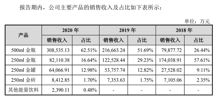 包装迭代对公司营收贡献明显。招股书显示,2018—2020年,500ml金瓶品类的总营收占比分别为26.44%、51.69%与62.51%。