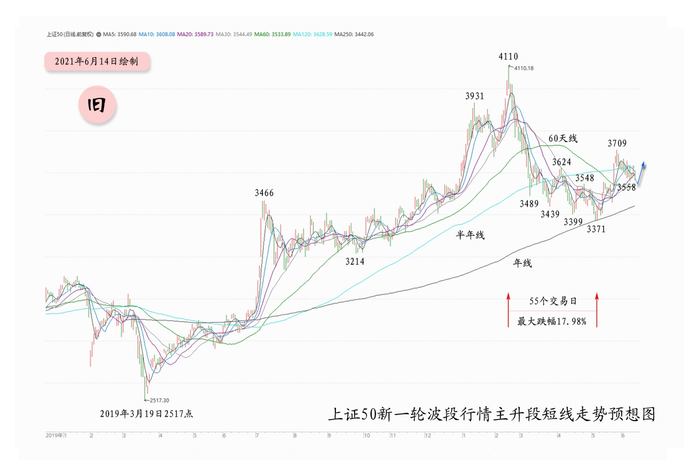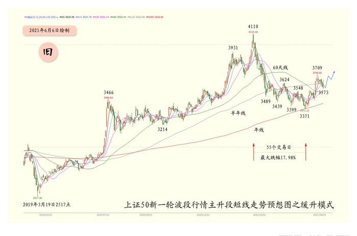 迄今为止,上证50实际的短线走势与我的预期有较大偏差,主升段的主升浪并没有如期开启,反倒最低跌回至周五(6月18日)3426点,与5月11日前低3371点只剩下1.63%的距离。