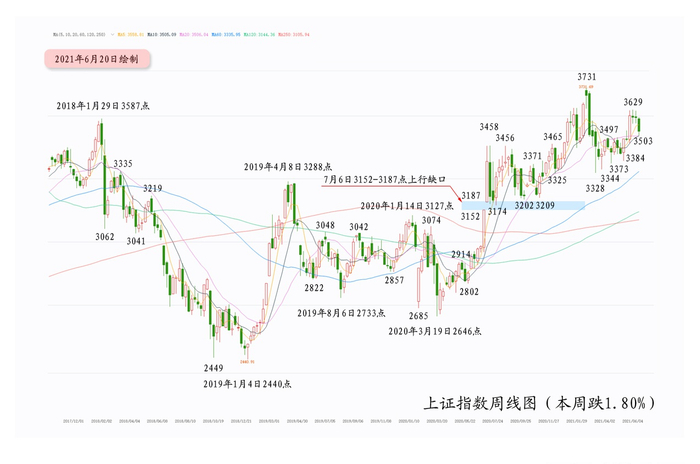 本周大盘单边下跌,最低跌至周五(6月18日)3503点,最终收于3525点,跌了1.80%。