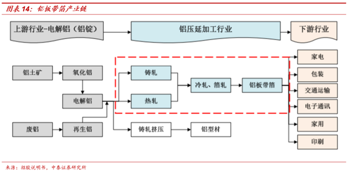 产业链上游:公司主要从事铝压延加工,即将电解铝(主要是铝锭)通过熔铸、压延、表面处理等多种工艺流程生产出铝板材、带材、箔材等产品,原材料主要为铝锭、铝坯料,铝锭属于电解铝行业,市场充分竞争,主要按照市场价对外采购。