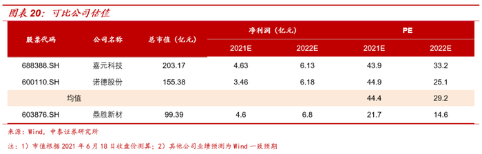 假设空调箔、单双零箔、普板带以及电池箔等产品加工费保持稳定,全球新能源汽车销量高增带动锂电铝箔需求快速增长,公司在锂电铝箔行业深耕多年,拥有技术、客户、规模优势,预计市占率将逐渐提升。我们预计公司2021/2022/2023年实现营业收入175.90/198.37/218.22亿元,目前股价对应的PE估值水平则分别为22X/15X/11X。公司估值位于历史估值均值水平,且与可比公司相比,估值水平处于较低位置,考虑到公司业绩快速成长性以及电池铝箔龙头地位,给予“买入”评级。