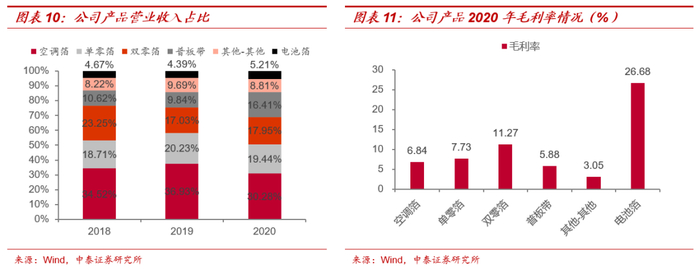 布局新能源车产业链,发力动力电池铝箔领域,将给公司注入持续增长动力。公司主要从事铝板带箔的生产及销售,主要产品为空调箔、单零箔、双零箔、普板带、电池箔等。从收入构成来看,2020年公司主要收入仍来源于空调箔,占比30.28%,环比减少6.65个百分点,空调箔属于低附加值产品,市场竞争激烈,毛利率仅为6.84%,而电池箔收入占比虽然仅为5.21%,但毛利率高达26.68%,公司逐步重点布局动力电池箔等高端产品: