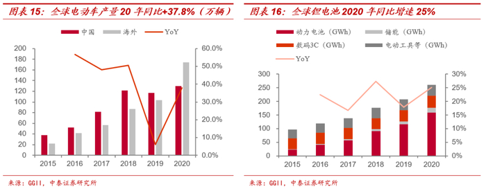 国内新能源汽车高景气,带动锂电池近3年CAGR达30%。根据GGII统计,2020年全球锂电池产量为260GWh,同比增长25%;其中动力电池产量为159.2GWh,同比增长37%。随着新能源汽车继续维持高景气以及储能市场的发展,全球锂电池产量继续维持高增长态势,我们预计2021-2025年的CAGR为31%,至2025年全球锂电池产量约1156GWh。