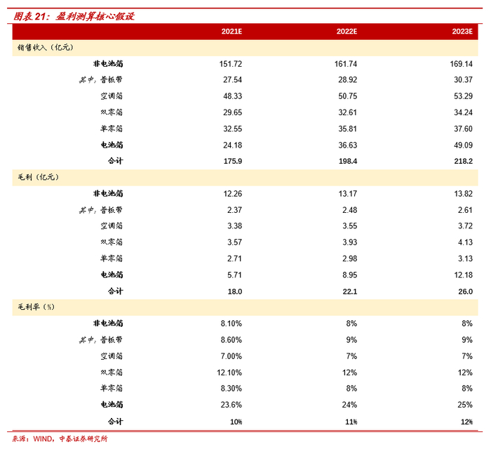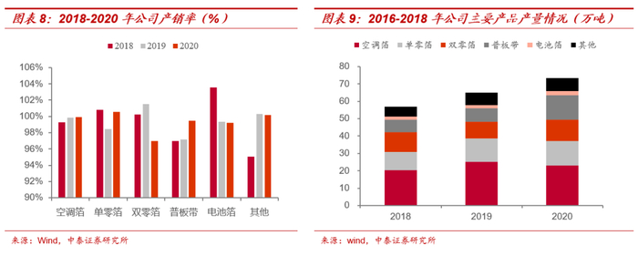 布局新能源车产业链,发力动力电池铝箔领域,将给公司注入持续增长动力。公司主要产品为空调箔、单零箔、双零箔、普板带、电池箔等。2020年公司主要收入仍来源于空调箔,占比约30%,但空调箔等属于低附加值产品,市场竞争激烈,毛利率仅接近7%,而电池箔收入占比虽然仅为5%,但毛利率高达27%,公司逐步重点布局动力电池箔等高端产品,新增产能的充分释放将给公司带来新的增长动力:1)公司电池箔产能快速扩张:8000吨动力电池涂炭铝箔项目和3.6万吨电池项目建成投产,募投项目5万吨预计于22年建成投产(4万吨电池光箔生产线和年产1万吨电池涂层箔生产线);2)切入轻量化领域,加码海外布局:公司当前拥有空调箔、单双零箔以及其他产品合计90万吨,此外,公司通过可转债募集资金切入轻量化领域,用于年产6万吨铝合金车身板项目和铝板带箔产线技术改造项目,另外,泰国单双零箔4万吨项目和意大利项目预计也在年底建成之后分批投产。