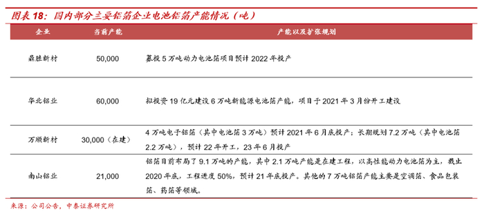 行业新增供给有限,公司电池箔产能持续扩张,布局泰国和意大利开拓海外市场。从行业层面来看,新建电池箔约需要2-3年周期(主要为订购设备和产品认证),未来1-2年新增供给较为有限。公司目前电池箔产能位居前列,并且产能扩张规模最为凸显。受疫情影响,其募投5万吨动力电池箔项目预计2022年建成投产。除了电池箔扩产外,公司为首家布局海外市场的铝箔企业,在泰国和意大利布局铝箔产能,2020年泰国4万吨铝箔已经陆续投产。