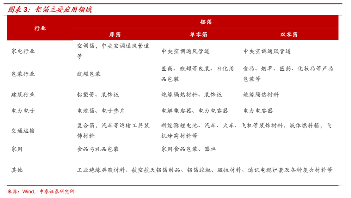 产业链下游:铝板带箔下游主要为家用电器、食品医药包装、电力电子、新能源汽车与电池等。其中家用电器受地产行业影响,具有一定的周期性,整体毛利率水平较低;消费品及包装方面,医药行业快速发展,为铝箔行业发展创造了需求;更为重要的是,作为锂离子电池充电电池正极集电体,全球新能源汽车电动化进程加速,电池箔作为新兴领域行业前景广阔。