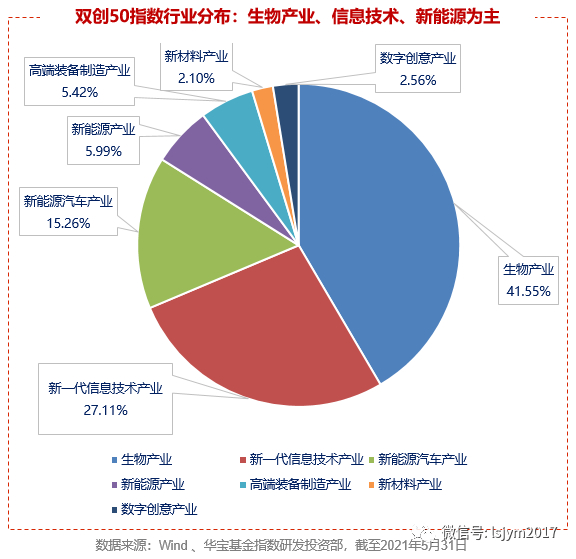 从成分股来看,目前双创50指数的成分股含31只创业板个股和19只科创板个股。成份股100%分布于战略新兴产业,其中生物产业、新一代信息技术产业、新能源汽车产业的权重占比分别为41.55%、27.11%、15.26%。