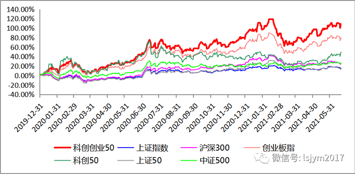 Wind数据显示,截至2021年6月18日,自2019年12月31日指数基日以来,双创50指数的累计涨幅达109.15%,远超A股一众宽基指数。