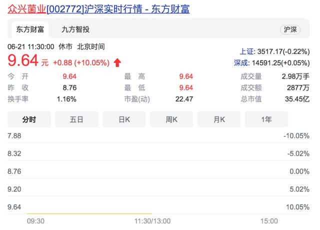 受消息刺激,6月21日众兴菌业竞价一字涨停,截至午间收盘,封单超115万手,报9.64元,总市值35.5亿元。