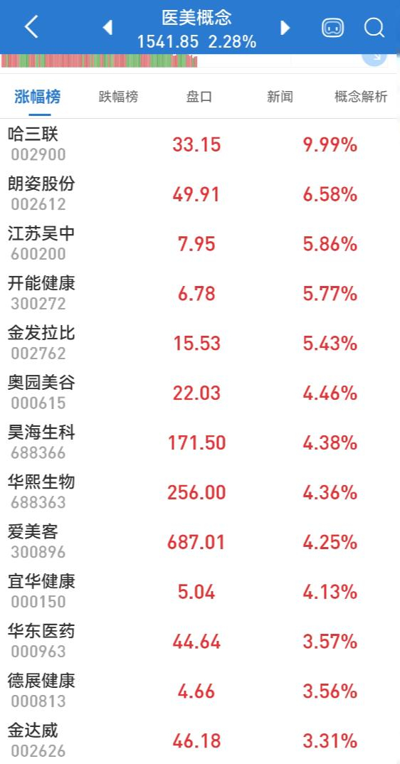 医美概念21日盘中再度活跃,截至发稿,哈三联涨停,朗姿股份涨逾8%,江苏吴中、开能健康、拉芳家化等涨幅超6%,宜华健康、金发拉比、爱美客、华熙生物、昊海生科等涨幅超5%。
