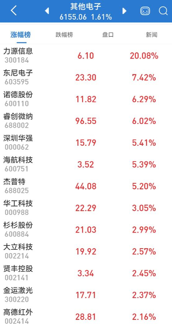 电子科技股早盘继续走强,半导体板块指数盘中创历史新高,氮化镓板块指数亦创历史新高,芯片板块指数则创近1年来新高,光刻机板块指数逼近年内新高。力源信息20%涨停,汉威科技、晶盛机电、晶晨股份等涨停或涨超10%。