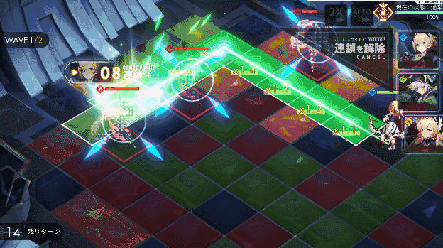 《白夜极光》在前者的消除+战斗的设计之外,舍弃了消除游戏的下落式布局,选用消除方块后随机出现新方块的设计,代替新方块出现的逻辑。同时加入一系列的机关,来提供实际玩法上的变数。
