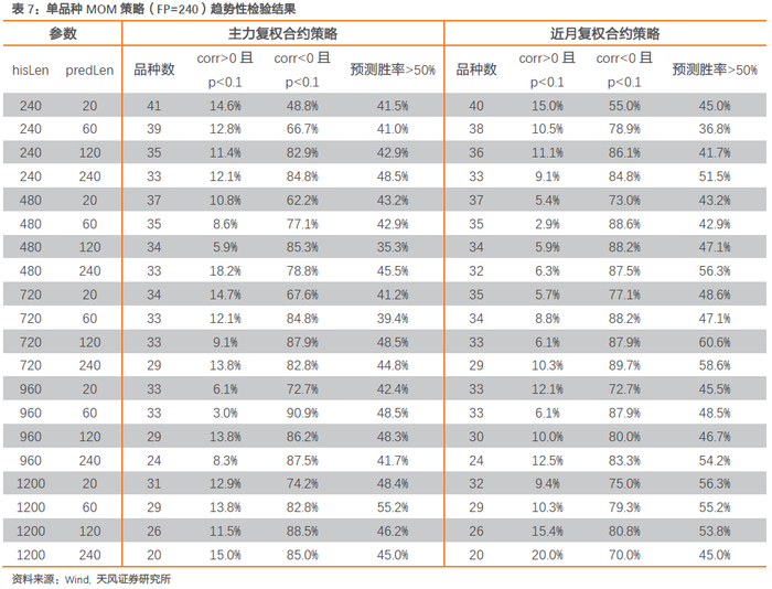 我们首先观察240日MOM策略在主力复权合约和近月复权合约下的趋势性。表7展示了单品种MOM策略在不同参数下的整体趋势性,列“corr>0且p<0.1”(即corr显著大于0)展示的是各品种MOM策略中在时间序列上具有趋势性的比例,列“corr<0且p<0.1”(即corr显著小于0)展示的是各品种MOM策略中在时间序列上反转现象更明显的比例,列“预测胜率>50%”展示的是不同时间窗口下历史收益与未来收益方向一致概率大于50%的品种比例。结果显示,两种合约下,单品种MOM策略动量效应强于反转效应的概率均不超过20%,大多数品种预测胜率不足50%。整体而言,单品种MOM策略并不存在明显的趋势性。
