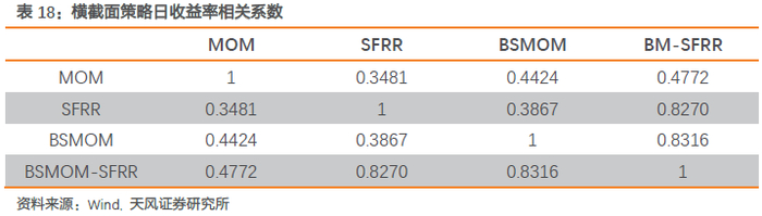 进一步,我们从时间序列上分析横截面策略的相关性。表18展示的是动量因子MOM、展期收益因子SFRR、基差动量因子BSMOM和二因子BM-SFRR策略日收益率的相关系数。与横截面分析结论一致,动量因子和展期收益因子具有更低的相关性,相关系数为0.35,与基差动量因子和二因子的相关系数分别为0.44和0.48。