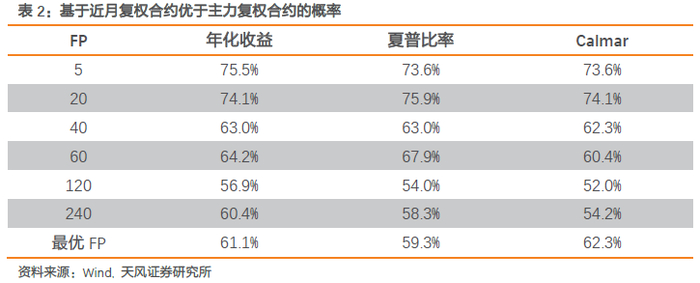 进一步地,我们在复权合约下,对比各品种在不同FP下基于近月合约和主力合约的策略表现。表2结果显示,所有参数下,无论基于何种收益指标,大部分品种交易近月合约的策略表现均优于交易主力合约,这与我们在系列报告十一(《信号来源与交易合约选择下的横截面策略改进》)中的结果具有一致性。