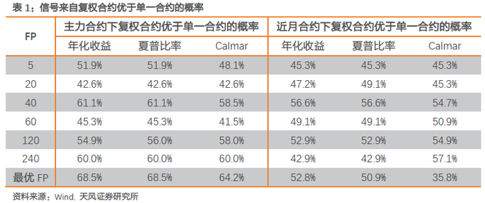 下面我们对比各品种基于复权合约和单一合约的策略表现,并统计复权合约优于单一合约的品种数及概率。从表1可以发现,当FP较小时,信号来自单一合约和复权合约的差异不大,从Calmar来看,来自同一合约的5日、10日动量优于复权合约。但随着FP的增大,尤其是大于60日后,复权合约信号的Calmar均优于同一合约信号,这与我们上文所说的信号损失导致的交易机会减少可能存在较大关系。