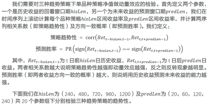 直觉上,我们更偏好历史表现优异的品种进行实操。即衍生出基于历史收益指标动态筛选样本品种的策略。这种做法依赖于一个假设,即策略具有动量效应,若全品种采用同样的历史表现回看窗口,则依赖于一个更强的假设:策略在所有品种上具有相同周期的动量效应。因此,在构建多品种策略前,我们有必要先检验上述假设,以此来判断根据历史业绩动态优选品种的方法是否可行。