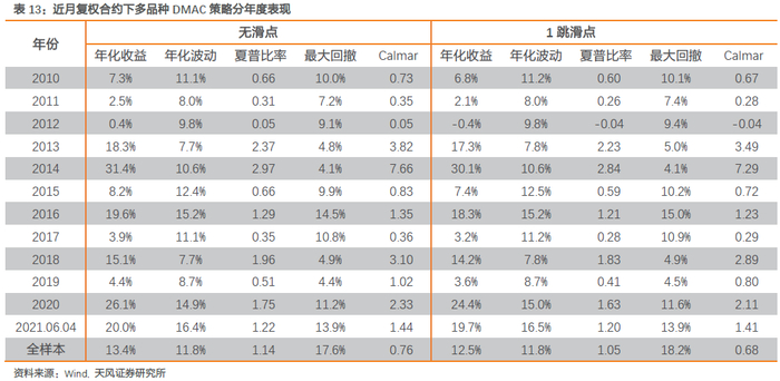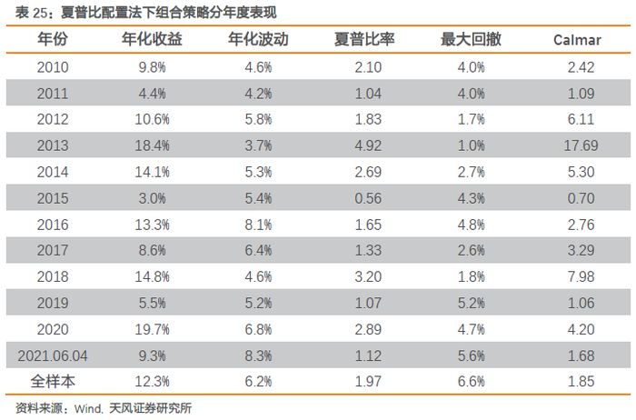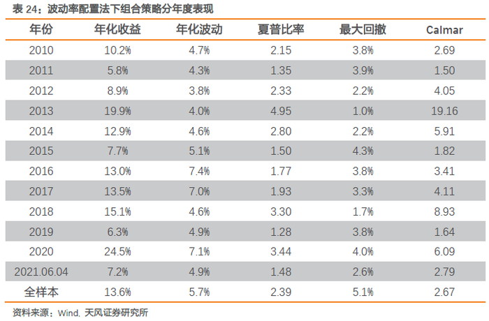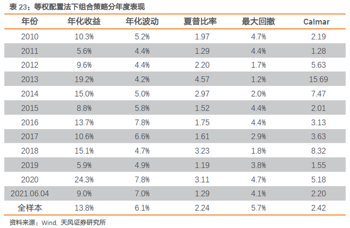 分年度来看,三种配置法下组合策略每年均能获取显著正收益。今年截至6月4日,波动率法、等权法、夏普比法组合策略收益分别高达7.2%、9.0%和9.3%。
