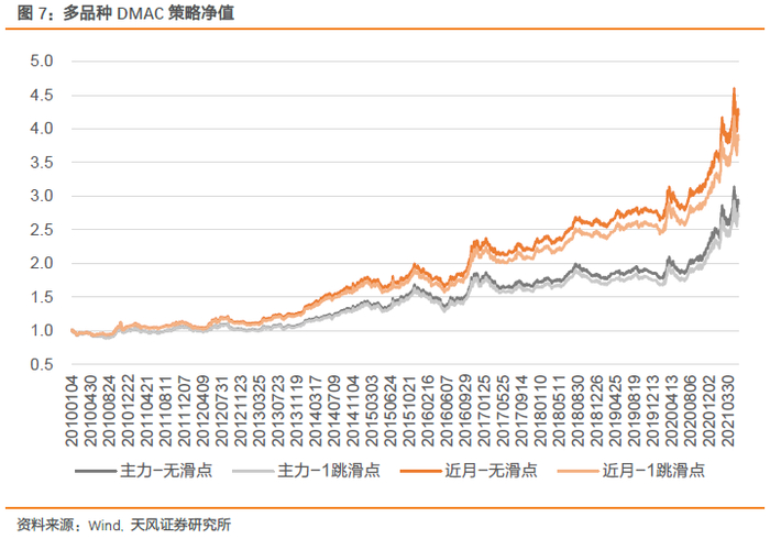 接下来我们回测多品种DMAC策略表现(b=0.1)。结合图表结果可以发现: