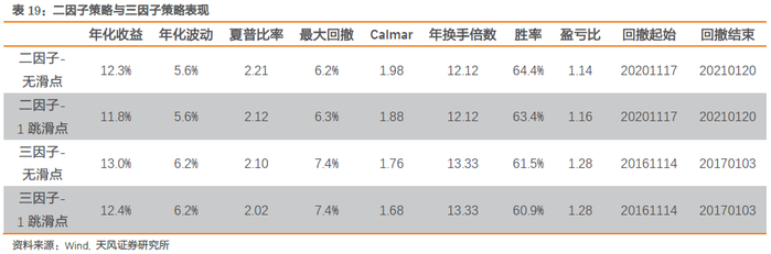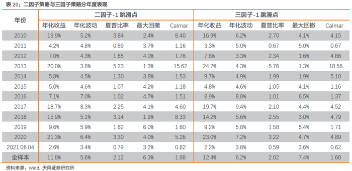从表20分年度结果来看,考虑滑点的二因子和三因子策略每年均能实现正收益。三因子策略在2013-2017年优势较明显,整体收益提升0.6%。