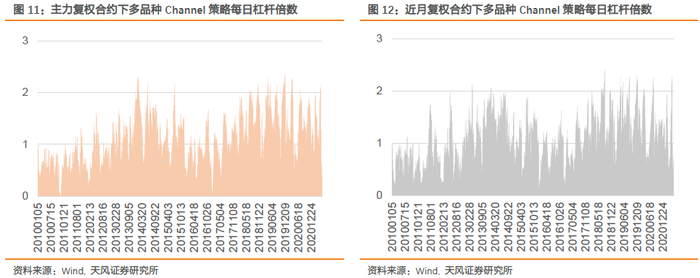 策略平均杠杆倍数1.1,最大杠杆倍数2.4,风险显著低于前两个策略。从图11和图12每日杠杆倍数来看,Channel策略能规避2011至2012的回撤以及减小2017至2019震荡市亏损的一重要原因是此期间较低的仓位。