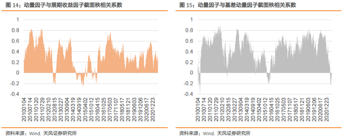 图14和图15展示了动量因子与基本面二因子的每日秩相关系数,更直观地反应了因子间相关性的动态变化。从图中可以看到,动量因子与二因子在2012下半年、2014年至2016上半年相关性较低,且大部分时间为负相关。因此,将动量因子加入横截面组合中可能具有一定增量效果。