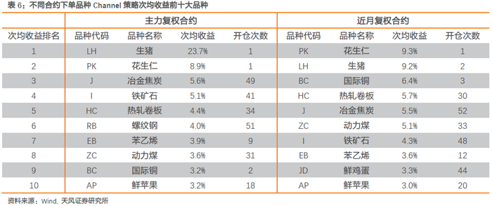 分品种来看,黑色系依然表现强势。不同合约策略下,焦炭、铁矿石、热卷、动力煤次均收益均排在前十,次均收益在3.6%以上,且开仓次数在30次以上,结论相对较可靠。此外,苯乙烯、苹果也表现优异,次均收益均在3%以上。