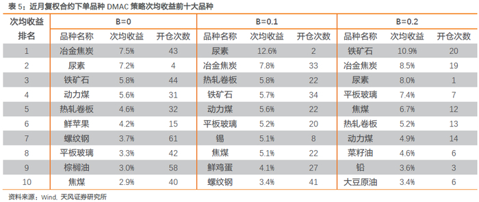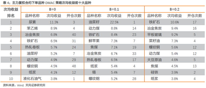 年化收益表现存在上市时间及开仓次数的影响,参考次均收益(单次收益的平均值)可能更客观。表4罗列了不同参数下次均收益排在前十的品种。结合开仓次数来看,其中黑色系品种表现最优异,各参数下前十大名额均占一半以上,前五名均占三个以上。分突破幅度来看,综合开仓次数和次均收益,B为0.1时前十大品种表现更佳,这一结论在交易主力和近月时具有一致性。分合约来看,不同突破幅度下,同一品种表现存在差异,以焦炭为例,B为0和0.1时,近月策略次均收益高于主力策略0.7%,而B为0.2时,主力策略次均收益相对更优。其余品种也具有类似结论。