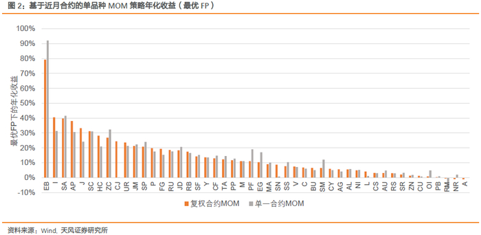 我们回测了单品种MOM策略在不同参数下的表现,图1和图2展示的是各品种在最优参数FP下的年化收益。结果显示,收益表现最佳的是苯乙烯,基于近月和主力复权合约信号的策略年化收益均在70%以上,铁矿石、纯碱、原油等品种收益也在30%以上,表现最弱的是菜籽粕,在各参数下均出现亏损,20号胶、豆一、沪铅也表现不佳。