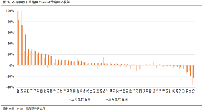54个品种在主力和近月复权合约下,Channel策略年化收益大于0的概率分别为70.4%和81.5%。其中花生仁和生猪的年化收益最高,在主力合约下高于100%,近月合约下也均高于60%,这在很大程度上受其上市时间短、开仓次数少的影响。除去开仓次数小于三次的品种,主力合约和近月合约下各品种平均年化收益分别为2.9%和5.6%。