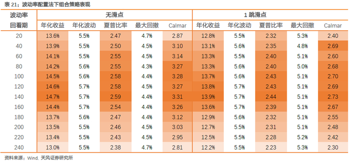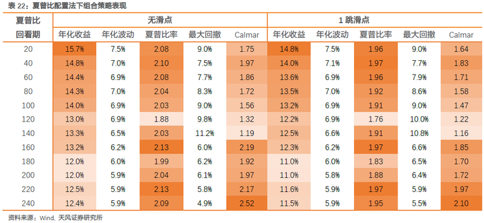 我们首先对比了波动率法和夏普比法下组合策略表现,仍以近月合约为信号和交易合约,采用月度再平衡,每月首个交易日新权重生效。从表21和表22结果来看,波动率配置法下,当回看期为100-160日时,组合策略表现强势且稳定性好,开平仓1跳滑点下年化收益达13.5%以上,夏普比达2.4,Calmar达2.7左右。夏普比配置法下,当回看期低于40日时策略年化收益高于14%,但波动和回撤相对较大,因此从夏普比和Calmar来看表现不及波动率配置法。